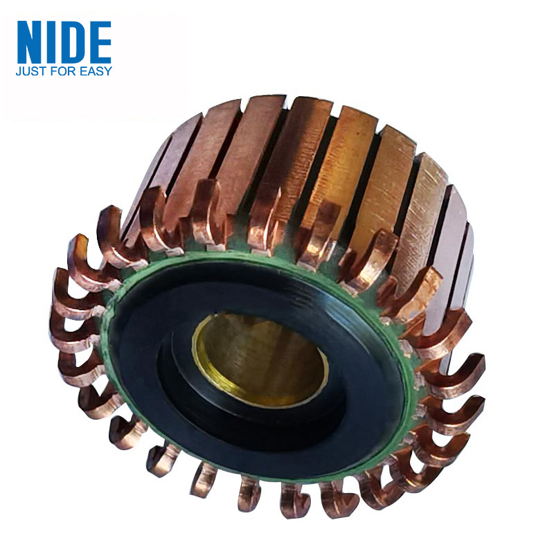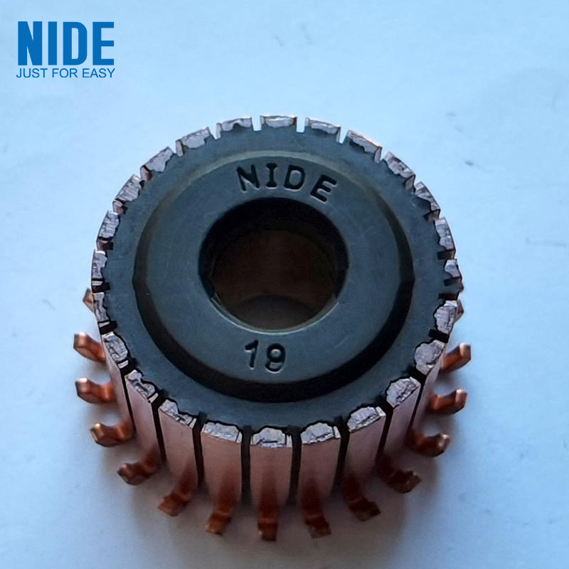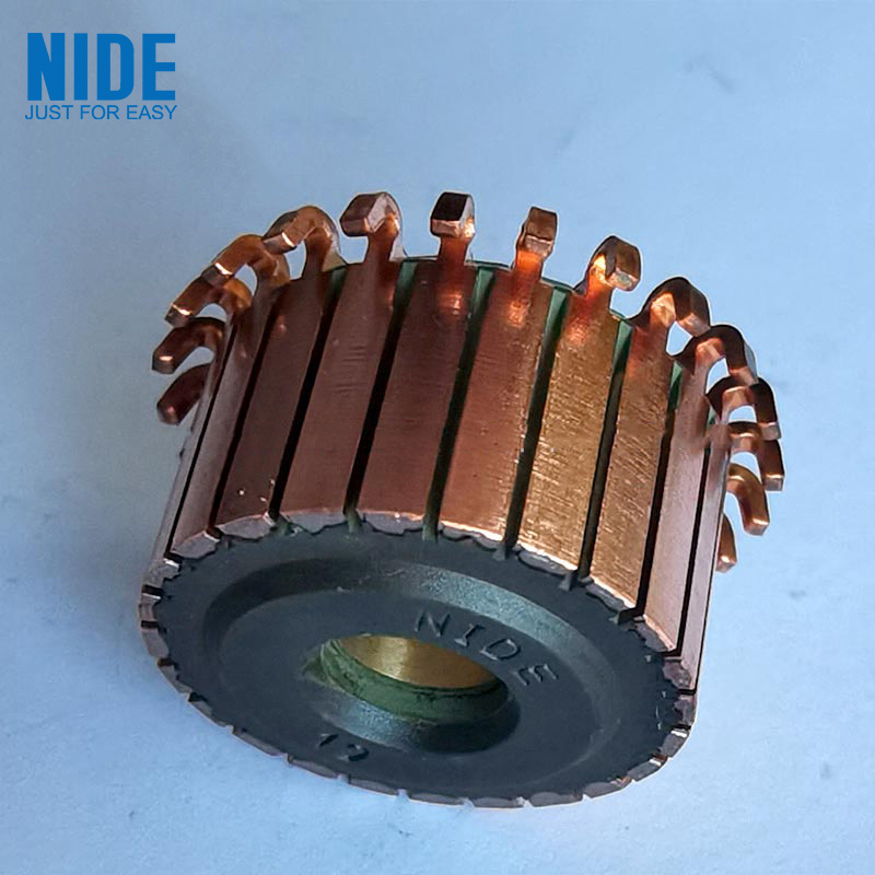 Motorni komutator RO pumpe uključuje bazu za kretanje unatrag napravljenu od bake lite praškasti materijal i bakreni lim tipa kuke koji je ravnomjerno raspoređen po obodu osnovnog tijela za okretanje. Gornji dio bakrenog lima sa kukom ima kuku. Ojačani prstenasti žljebovi su predviđeni na gornjoj i donjoj krajnjoj površini bakrenog lima koji se okreće, a susjedni reverzni bakreni limovi su izolirani i izolirani listovima liskuna. Karakteristika je da je armaturni prsten smješten u žljebu armaturnog prstena okružen sa više prstenova. Broj keramičkih perli je isti kao i broj komutirajućih bakrenih ploča tipa kuka.